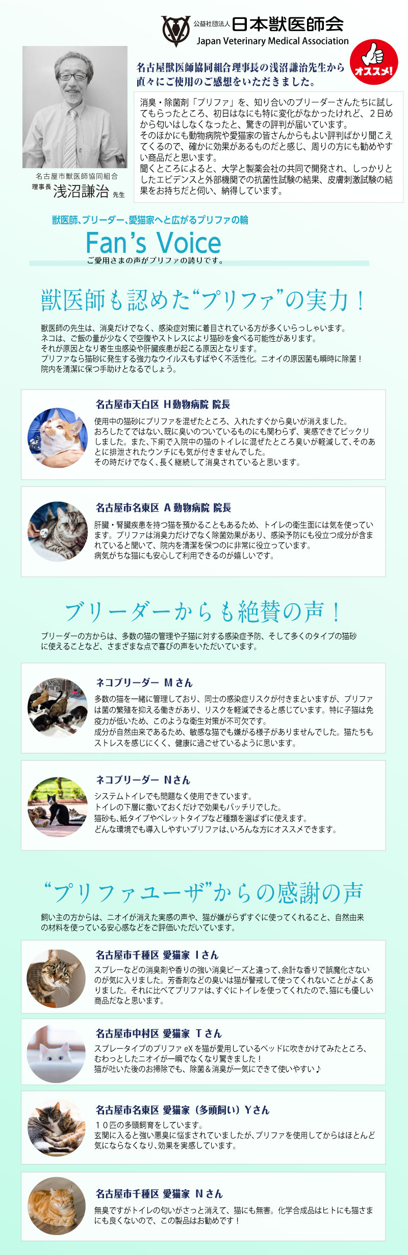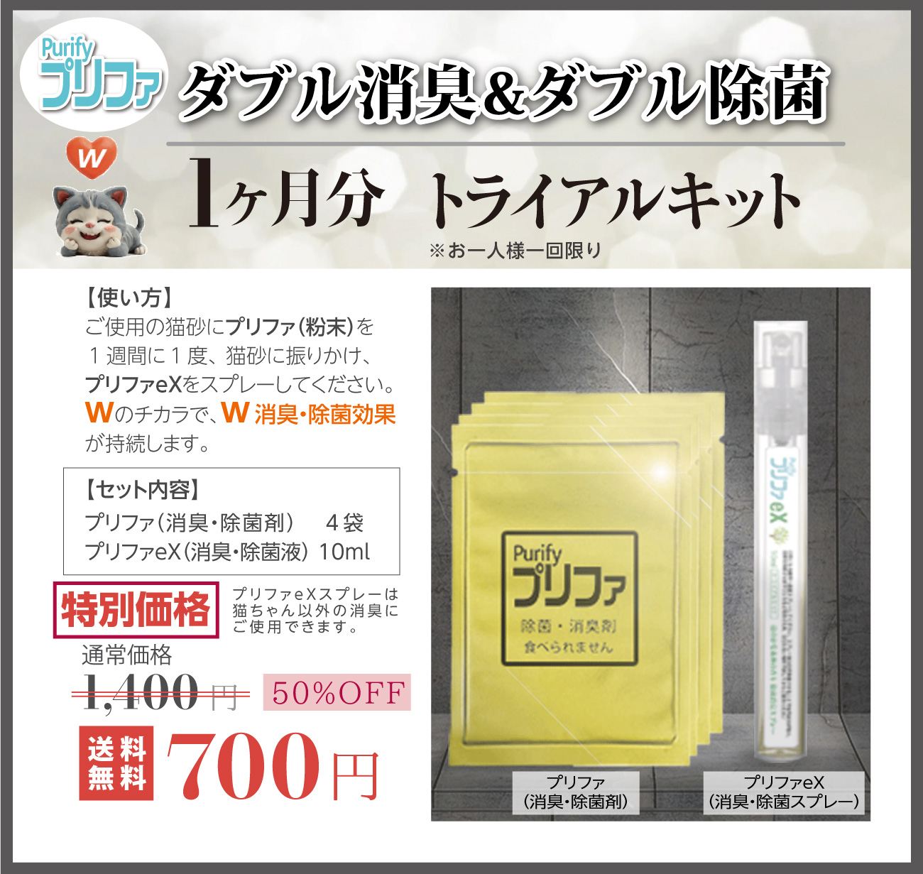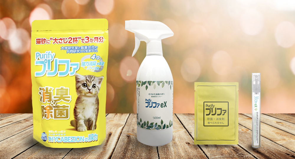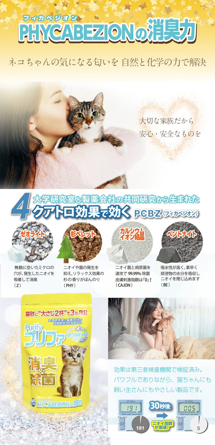 プリファは、有用成分の組み合わせ「フィカべジオン」により、いつもの猫砂に混ぜるだけで即効消臭できる、全く新しい製品です。