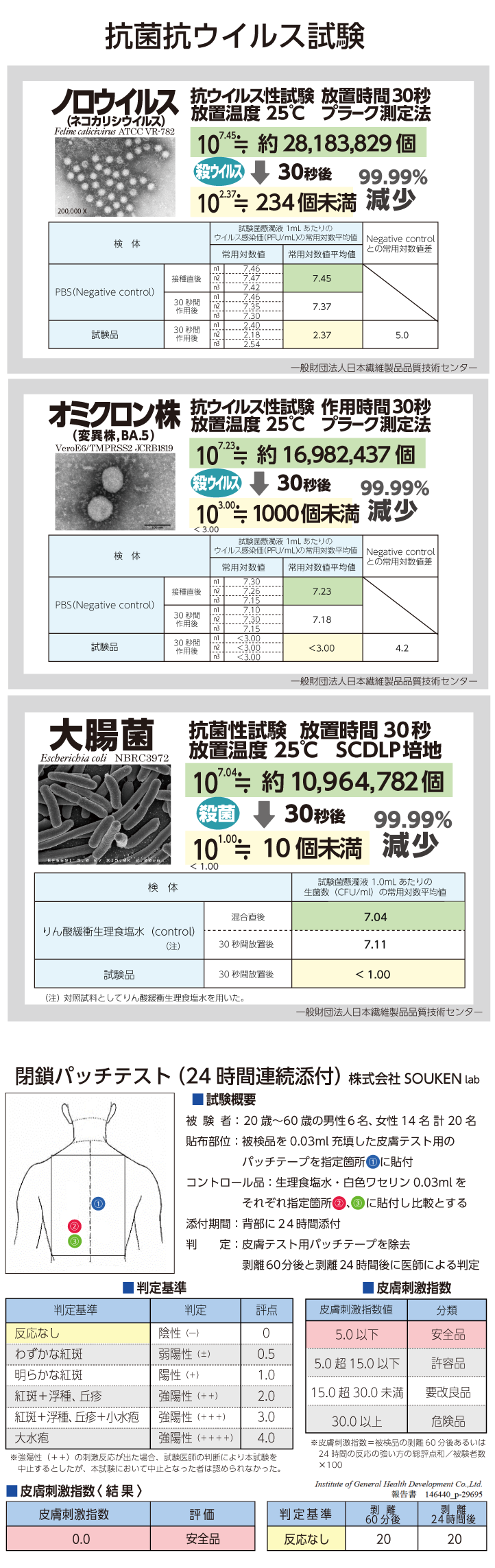 この強力でありつつも安全性にすぐれたイオン結晶は、菌によるニオイの発生を取り除きます。また、ネコカリシウイルス(ノロウイルス代替)・大腸菌・新型コロナウイルスオミクロン株の抗菌坑ウイルス性試験を実施し、30秒間で99.99%除去できることを確認し、さらに安全性として、パッチテスト(株式会社SOUKEN・24時間閉塞パッチテスト)を実施し、皮膚刺激性は「0」と評価されました。