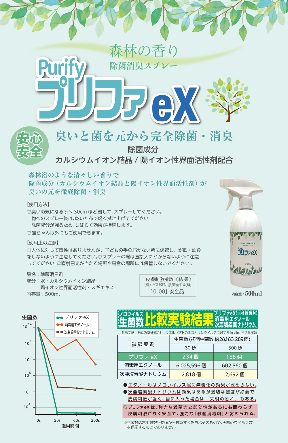 プリファの有効成分である「カルシウムイオン結晶」は、大学研究室と製薬会社の共同研究から生まれ、一般財団法人日本繊維製品品質技術センターの品質試験では、 最も強いとされる「ネコカリシウイルス(ノロウイルス)」と「大腸菌」の検証で、99.99%の除菌効果が証明されています。安心・安全なプリファが感染症を防ぎます。