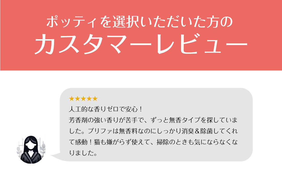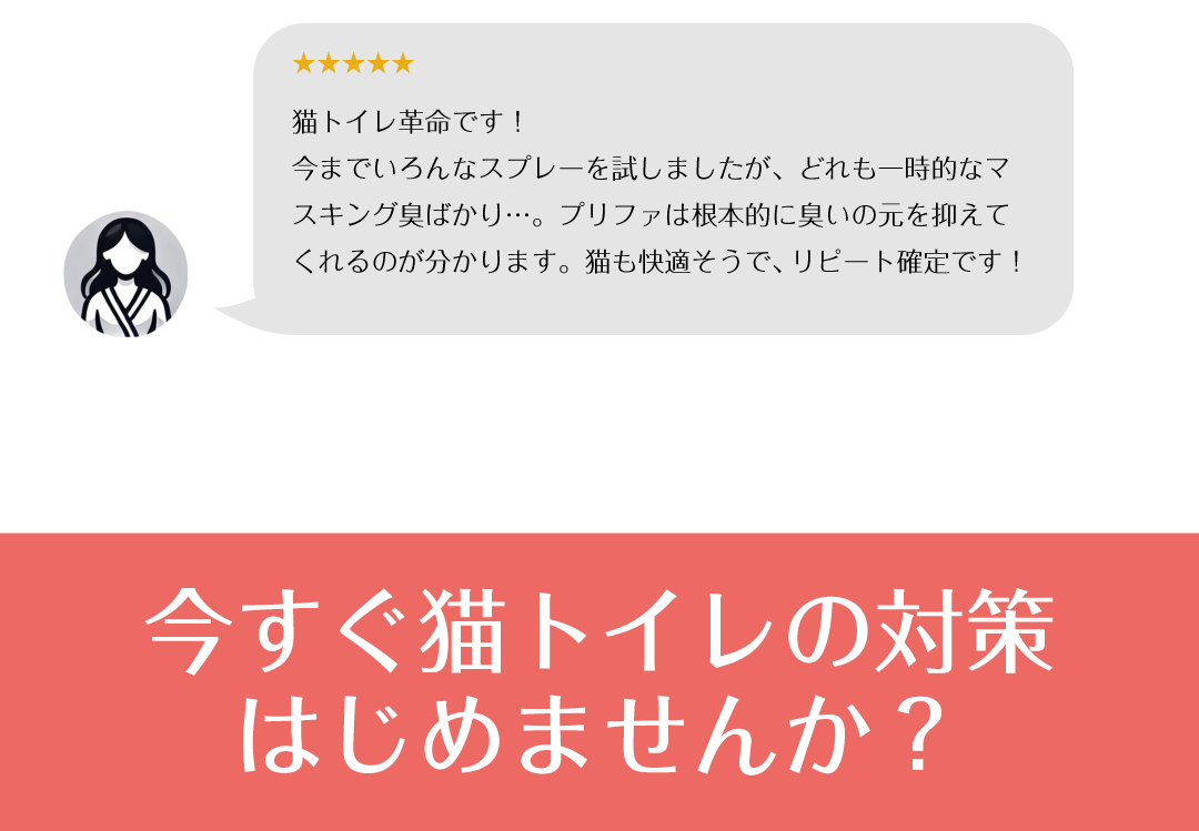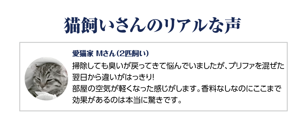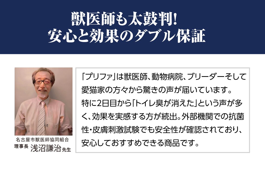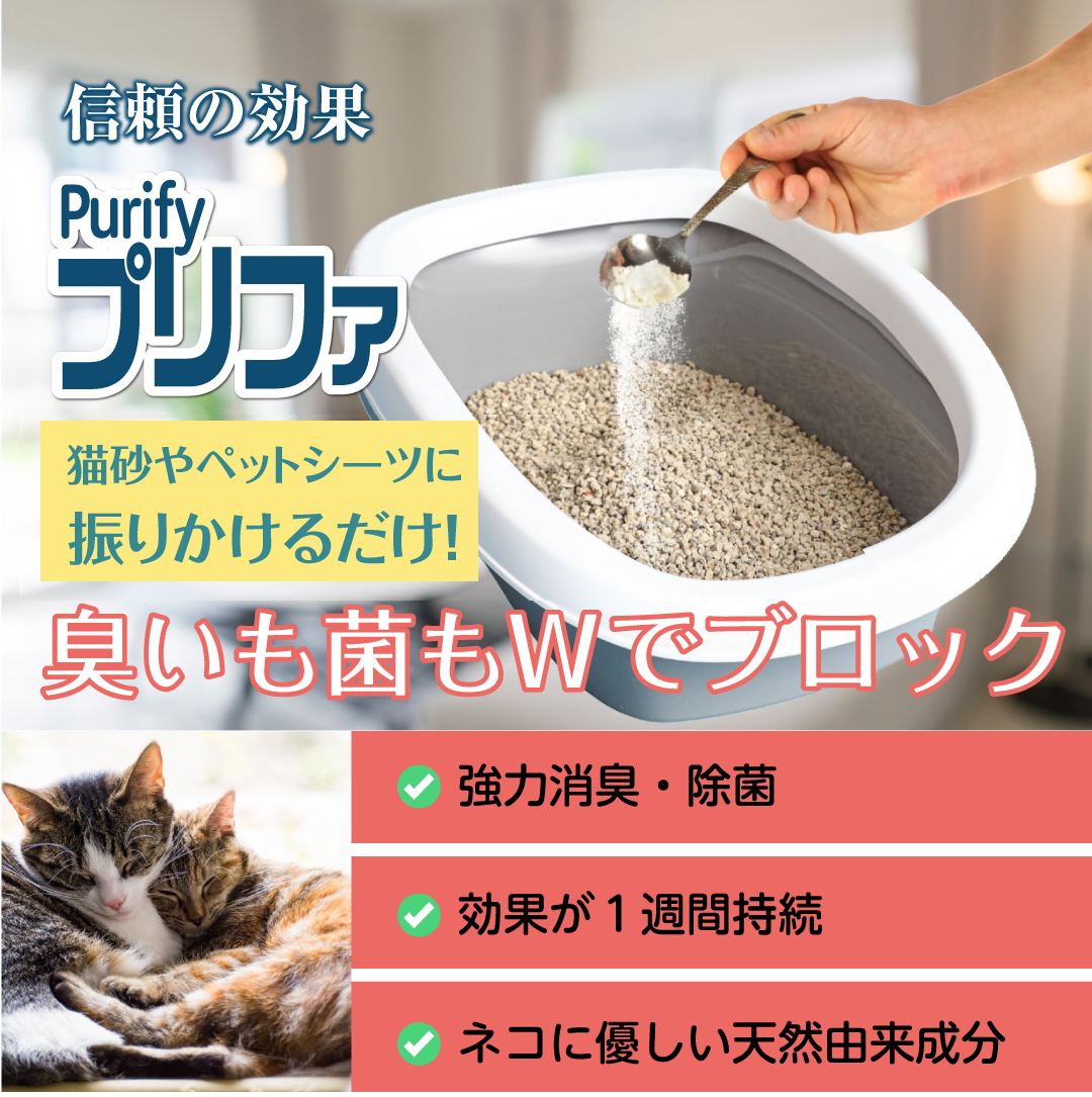 猫トイレのニオイ、絶対に許さない!原因の“菌”を断ち切るため、大学と製薬会社が共同開発したのが『プリファ』 猫砂やペットシーツにひと振りで強力消臭&除菌、効果は1週間持続。 芳香成分ゼロで猫も家族も安心。空気まで澄みわたる快適な毎日へ。