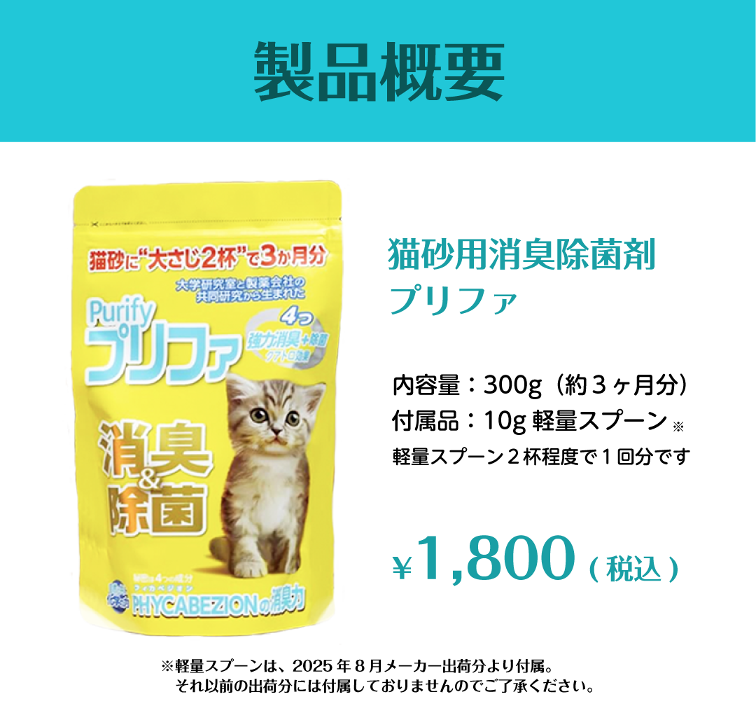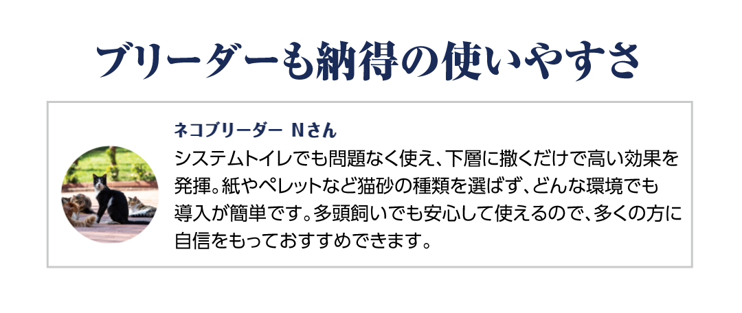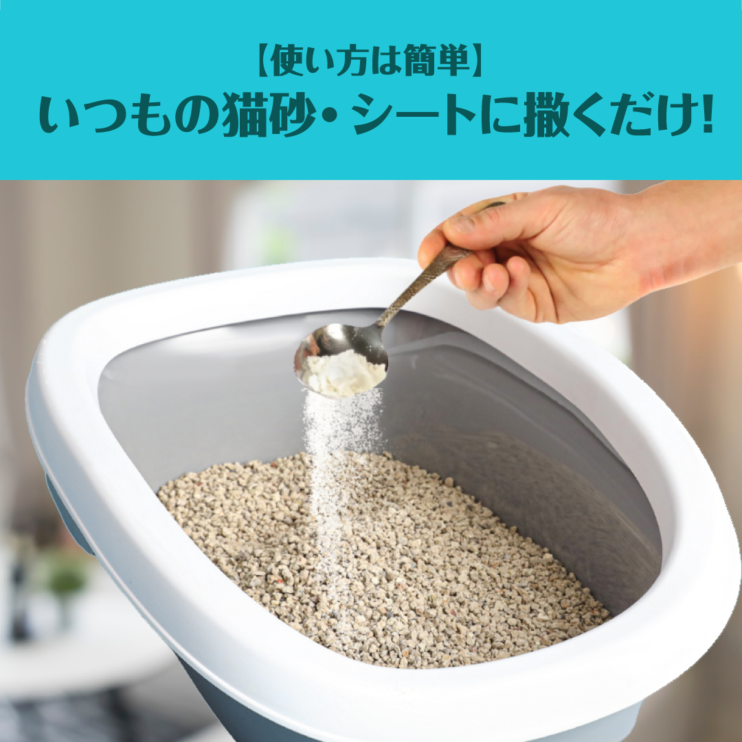使用方法はとても簡単。いつもご使用の猫砂やペットシーツに、スプーン2杯(約25g)を撒くだけ。猫砂やトイレの種類も問わずに使えるため、猫ちゃんも違和感なく使ってくれます。