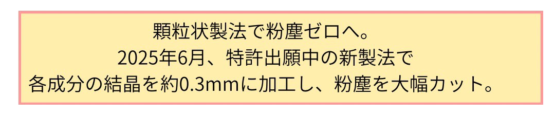 独自の顆粒成形(0.3mm、特許出願中)で粉塵を大幅カット。